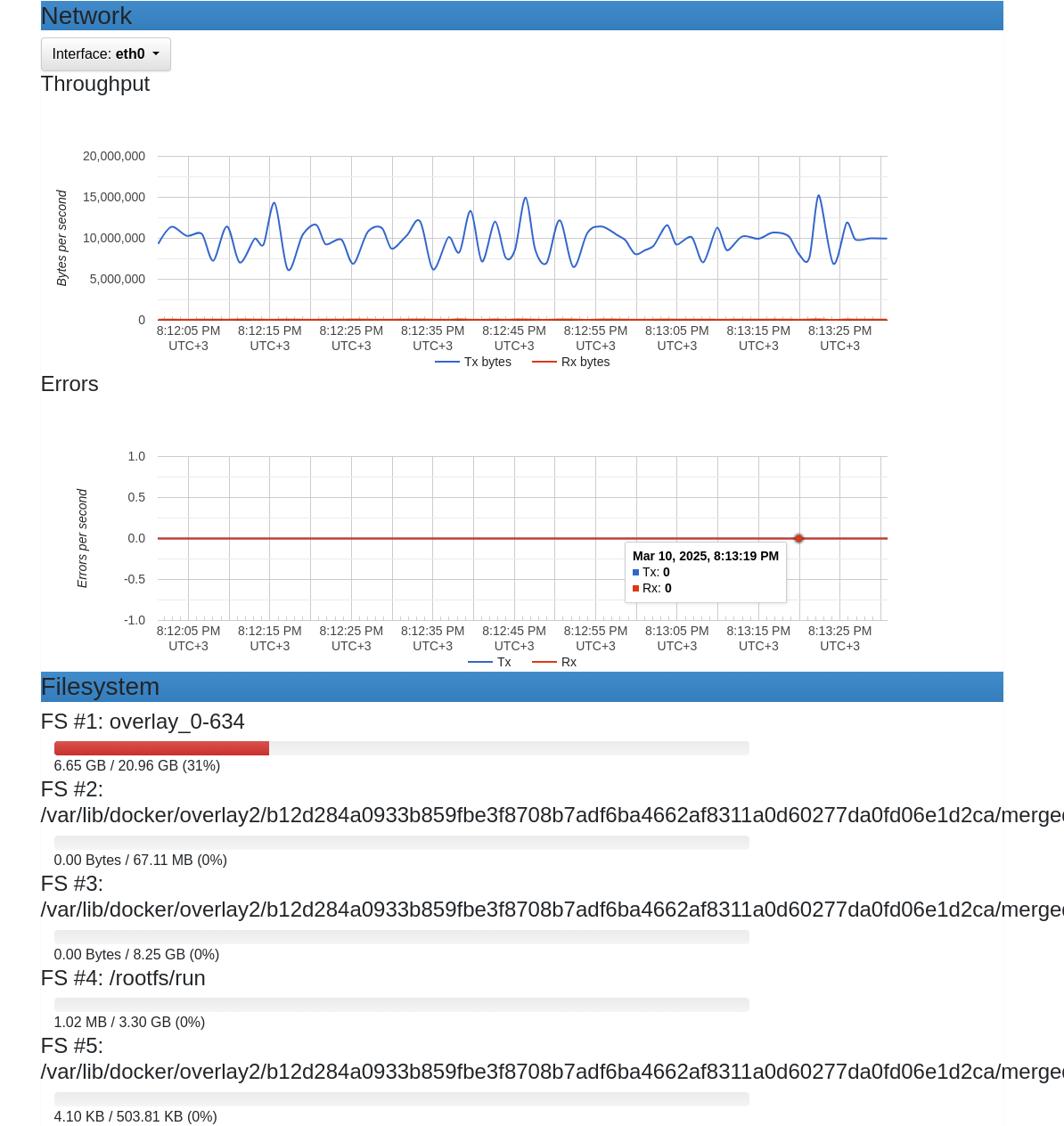 После запуска откройте браузер и перейдите по адресу http://server_ip:8090. На главной странице можно увидеть графики использования CPU, памяти, сети и файловой системы docker хоста, а перейдя в Docker Containers вы можете посмотреть список всех контейнеров и информацию о каждом из них.